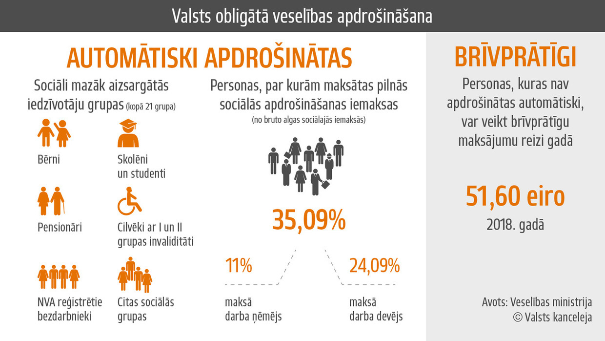 Iemaksu veikšana būs brīvprātīga un attieksies tikai uz tām personām, kuras nav apdrošinātas automātiski. Personas, kuras veic sociālās apdrošināšanas iemaksas vispārējā nodokļu režīmā vai ietilpst kādā no sociāli mazāk aizsargātajām iedzīvotāju grupām - pensionāri, bērni, personas, kurām noteikta I vai II grupas invaliditāte, Nodarbinātības valsts aģentūrā reģistrēti bezdarbnieki, skolēni un pilna laika programmās studējošie, kā arī citi sociāli atbalstāmi cilvēki* - ir apdrošinātas automātiski un papildus iemaksas veselības apdrošināšanai viņām nebūs jāveic.