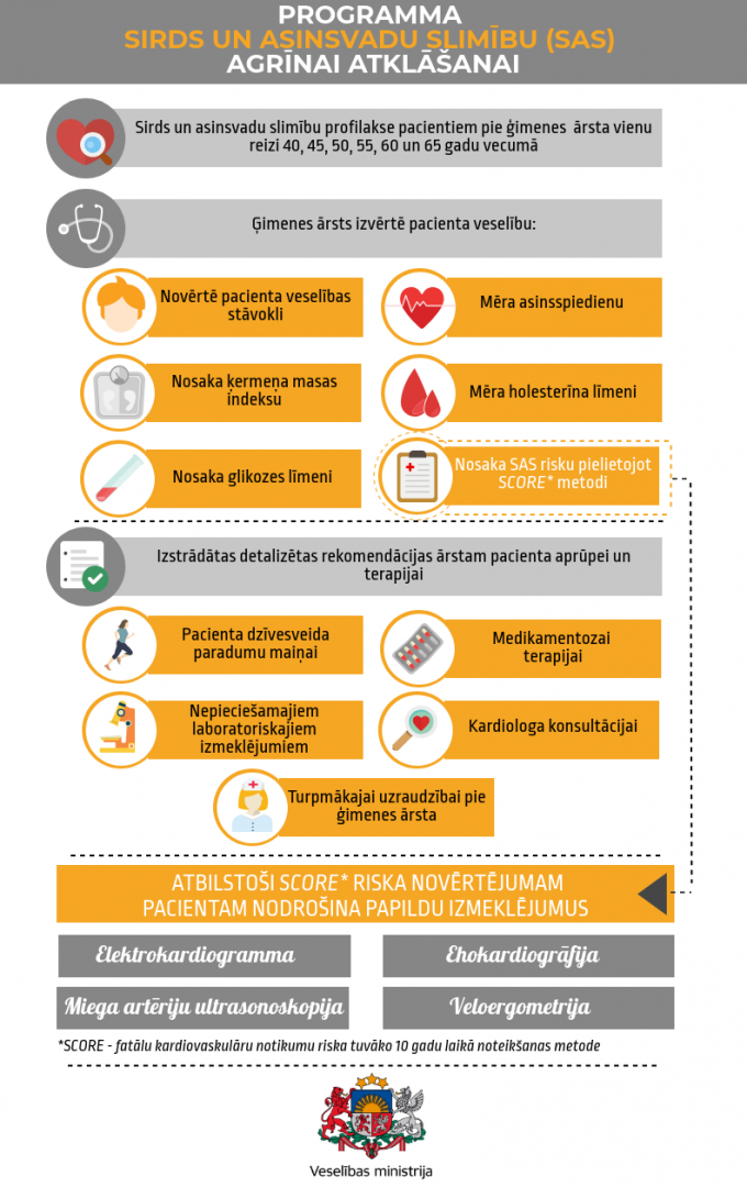 Noteikts, ka papildus ikgadējai profilaktiskajai apskatei pie ģimenes ārsta pacientam 40, 45, 50, 55, 60 un 65 gadu vecumā vienu reizi tiks novērtēts sirds un asinsvadu saslimšanu risks atbilstoši SCORE metodei**, pirms tam veicot sirds un asinsvadu un smēķēšanas anamnēzes izvērtēšanu, asinsspiediena noteikšanu, ķermeņa masas indeksa, kopējā holesterīna un glikozes līmeņa asinīs noteikšanu, kā arī sirds un miega artēriju auskultāciju.