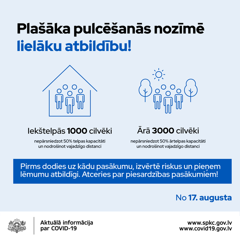 Valdība arī lēma, ka no 17. augusta iekštelpās vienlaicīgi varēs pulcēties līdz 1000 cilvēkiem, pašreizējo 500 vietā, savukārt ārtelpās, kā to jau paredzēja esošā MK noteikumu redakcija, maksimāli pieļaujamais skaits ir līdz 3000 cilvēku. Turpmāk vairs netiks arī dalīti ierobežojumi cilvēku skaitam atkarībā no telpu platības, bet ikvienā pasākumā būs jānodrošina minimālā platība uz vienu cilvēku - 3 m2 iepriekš noteikto 4 m2 vietā (arī tirdzniecības centros un kultūras norises vietās). Pēc speciālistu aprēķiniem šī ir mazākā platība uz vienu cilvēku, lai konkrētā vietā būtu iespējams nodrošināt 2 metru distanci starp cilvēkiem. Tāpat cilvēku skaits, kas vienlaicīgi pulcējas konkrētā vietā, nedrīkst pārsniegt 50%, ko pieļauj konkrētās vietas kapacitāte. Šo nosacījumu var neievērot, ja ir iespējams nodrošināt, ka tiek nodalītas cilvēku grupas pa 300, kas savstarpēji nesastopas nevienā pasākuma norises posmā. Tas nozīmē, ka šiem cilvēkiem ir jānodrošina atsevišķa ieeja, izeja, tualetes, vieta starpbrīžiem utml. Šo nosacījumu var piemērot, piemēram, koncertos un teātros.