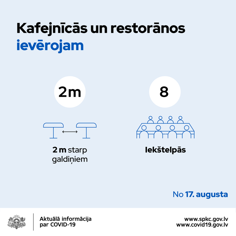 Tāpat kafejnīcās un restorānos turpmāk pie viena galdiņa iekštelpās varēs sēdēt 8 cilvēki, savukārt ārtelpās cilvēku skaita ierobežojums vairs netiks noteikts. Tāpat valdība lēma samazināt uz vienu cilvēku nosakāmo kvadrātmetru skaitu no 4 m2 uz 3 m2. Savukārt prasība nodrošināt 2 m distanci starp galdiņiem būs saglabāta arī turpmāk, jo, nodrošinot 2 m distanci starp galdiem, starp cilvēkiem patiesā distance ir mazāka – aptuveni metrs, kas ir minimāli pieļaujamā distance, lai mazinātu Covid-19 transmisiju.