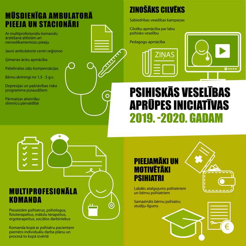 18. jūnijā Ministru kabinets apstiprinājis Veselības ministrijas virzīto “Psihiskās veselības aprūpes pieejamības uzlabošanas plānu 2019. – 2020. gadam”, kurā iekļauta virkne ar veselības ministres Ilzes Viņķeles virzītām iniciatīvām, to realizācijai šogad novirzot 6,7 miljonus eiro.