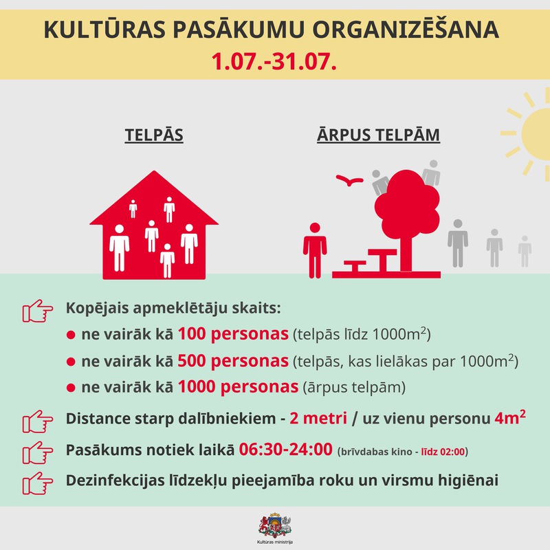 Kā obligāts nosacījums gan kultūras pasākumu norisē, gan kultūras iestāžu un izstāžu zāļu darbībā arī turpmāk noteikta 2 metru distances ievērošana starp personām jeb 4 m² platības uz vienu personu nodrošināšana (nepārsniedzot 50% no telpas ietilpības), kā arī dezinfekcijas līdzekļu pieejamība roku un virsmu higiēnas nodrošināšanai pasākuma norises vietās un kultūras iestādēs, izstāžu zālēs. Ieteicama biļešu iegāde tiešsaistē, izmantojot internetu, ja šāda iespēja ir nodrošināta.