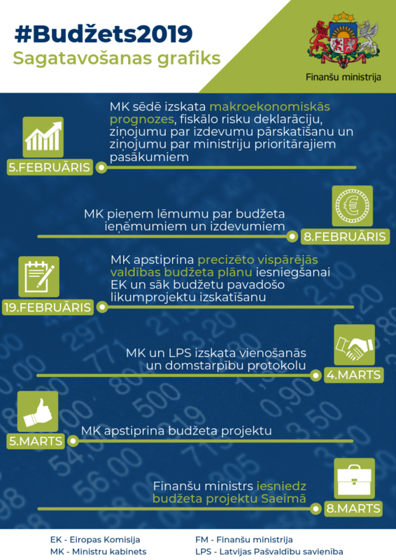 Otrdien, 29. janvārī, valdība apstiprināja Finanšu ministrijas (FM) sagatavotu vidēja termiņa budžeta ietvara 2019., 2020. un 2021. gadam un valsts budžeta likumprojekta 2019. gadam sagatavošanas grafiku. Plānots, ka valdība izstrādāto budžeta projektu Saeimai iesniegs 8. martā.