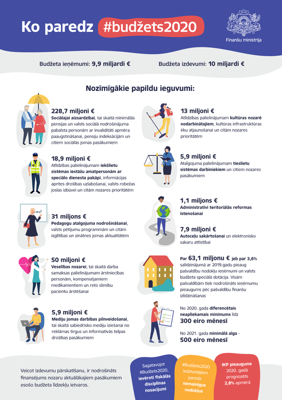 Piektdien, 11. oktobrī, Ministru kabineta (MK) sēdē apstiprināts likumprojekts par valsts budžetu 2020. gadam. 2020. gada valsts konsolidētā budžeta ieņēmumi plānoti 9,9 miljardu, bet izdevumi 10 miljardu eiro apmērā. Pamatbudžetā plānotie ieņēmumi veido 6,9 miljardus, bet izdevumi 7,2 miljardus eiro. Savukārt speciālajā budžetā ieņēmumi plānoti 3,2 miljardu eiro, bet izdevumi 3,0 miljardu eiro apmērā. 2020. gada vispārējās valdības budžeta deficīts plānots 0,3% apmērā no iekšzemes kopprodukta (IKP). Savukārt IKP pieaugums 2020. gadā prognozēts 2,8% apmērā.
