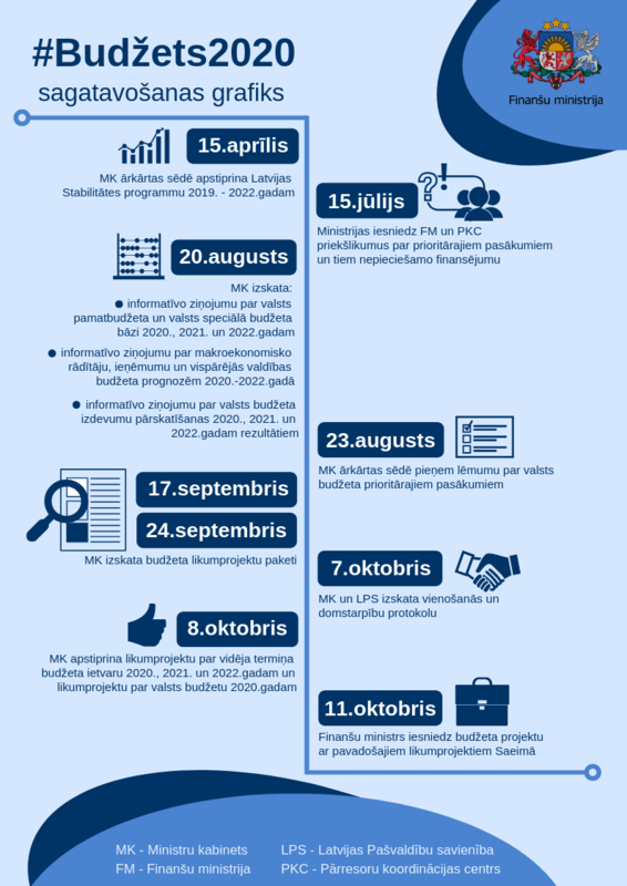 Saeimā 2020. gada budžeta likumprojektu paketi paredzēts iesniegt šā gada 11. oktobrī. Lai ievērotu noteiktos termiņus, nepieciešams savlaicīgi uzsākt darbu pie gadskārtējā un vidēja termiņa budžeta likumprojekta sagatavošanas, nodrošinot vispusīgu analīzi un diskusijas, pirms galīgo lēmumu pieņemšanas.