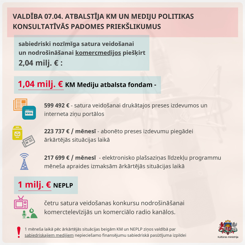 Lai plašsaziņas līdzekļi varētu turpināt operatīvas un kvalitatīvas informācijas nodrošināšanu sabiedrībai Covid-19 radītās ārkārtējās situācijas laikā, valdība 7. aprīlī apstiprināja Kultūras ministrijas (KM), Mediju politikas konsultatīvās padomes un NEPLP izstrādātos mediju atbalsta pasākumus, to īstenošanai piešķirot 2 040 928 eiro no valsts budžeta līdzekļiem neparedzētiem gadījumiem.