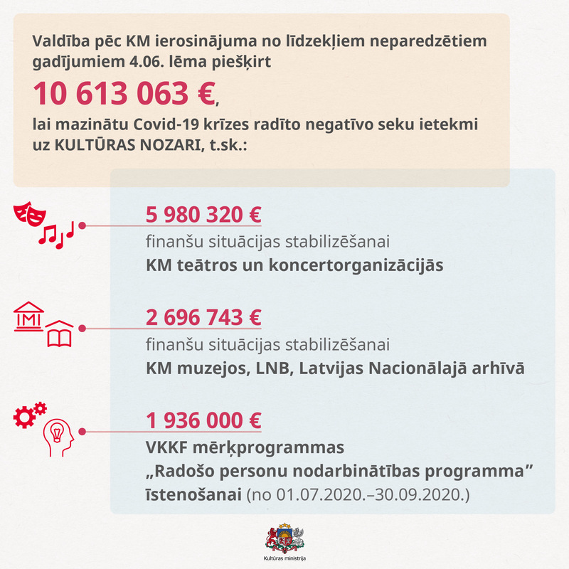 Jau ziņots, ka pasākumiem Covid-19 izraisītās krīzes pārvarēšanai un ekonomikas atlabšanai investīcijām kultūrā tika lemts piešķirt 32 miljonus eiro: 10,6 miljonus eiro Covid-19 radīto seku mazināšanai valsts kultūras iestādēs; 10,4 miljonus eiro modernizācijas pasākumiem kultūras nozarē - valsts pasūtījumiem jaunu kultūras vērtību radīšanā, kā arī 11 miljonus eiro kultūras infrastruktūrai.
