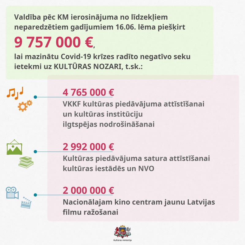 Valdība pēc Kultūras ministrijas (KM) izstrādāta rīcības plāna šodien, 16. jūnijā, no līdzekļiem neparedzētiem gadījumiem lēma 2020. gadā piešķirt 9,7 miljonus eiro kultūras un pasākumu nozares iestādēm, uzņēmējiem, radošajām personām un nevalstiskajām organizācijām. Finansējuma mērķis ir sniegt visaptverošu atbalstu Covid -19 izraisītās ārkārtējās situācijas radīto negatīvo seku mazināšanai, veicināt jaunradi un ekonomisko aktivitāti, kultūras nozares ilgtspēju un izaugsmi.