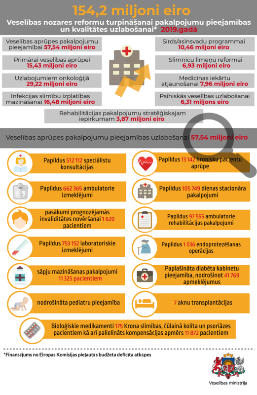 No šīs summas šogad veselības aprūpes pakalpojumu pieejamības uzlabošanai un rindu mazināšanai paredzēti 57,54 miljoni eiro; onkoloģisko saslimšanu diagnostikas un ārstēšanas pieejamības uzlabošanai – 29,22 miljoni eiro; infekcijas slimību izplatības mazināšanai – 16,48 miljoni eiro; primārās veselības aprūpes sistēmas kvalitātes un pieejamības uzlabošanai – 15,43 miljoni eiro; kardiovaskulārās saslimstības mazināšanai un slimību ārstēšanas efektivitātes uzlabošanai – 10,46 miljoni eiro; ārstniecības iestāžu līmeņu reformai – 6,93 miljoni eiro; rehabilitācijas pakalpojumu stratēģiskajam iepirkumam – 3,87 miljoni eiro; psihiskās veselības aprūpes uzlabošanai paredzēti 6,31 miljoni eiro; vides uzlabošanai un infrastruktūras efektivizēšanai – 7,96 miljoni eiro.