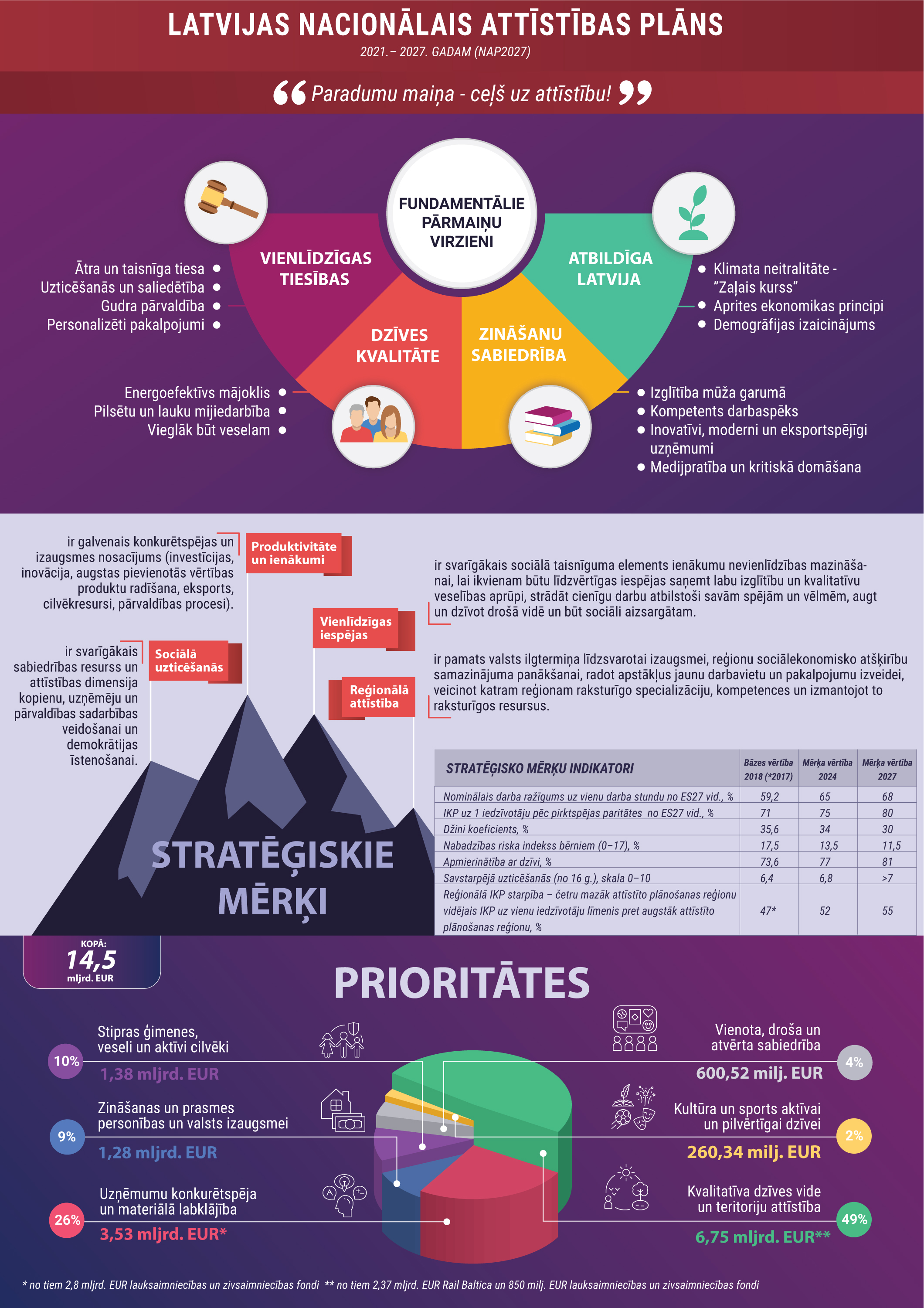 Ar plašu sabiedrības līdzdalību Pārresoru koordinācijas centra (PKC) vadībā izstrādātais Latvijas Nacionālais attīstības plāns 2021. - 2027. gadam (NAP2027) nosaka stratēģiskos mērķus, prioritātes un uzdevumus valsts attīstībai nākamajiem septiņiem gadiem, lai panāktu Latvijas un ikviena iedzīvotāja izaugsmi un labklājības pieaugumu. NAP2027 izstrādāts, veicot dziļu pašreiz spēkā esošā NAP2020 vidusposma rezultātu analīzi, ņemot vērā Latvijas Ilgtspējīgas attīstības stratēģijā līdz 2030. gadam izvirzītos mērķus un ANO Ilgtspējīgas attīstības 17 mērķus. NAP2027 izstrādē intensīvi strādājušas tā sešu prioritāšu darba grupas, iesaistot kopumā vairāk nekā 150 pārstāvjus no nevalstiskajām organizācijām, valsts un pašvaldību iestādēm, zinātniekus, uzņēmējus, politiķus, kā arī notikušas fokusa grupu diskusijas visos Latvijas reģionos.
