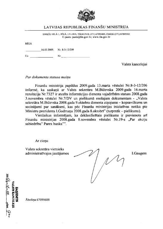 Finanšu ministrijas 2009.gada 16.marta vēstule "Par dokumenta statusa maiņu"